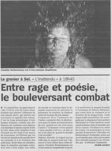 Les mots de Melquiot, la comédienne Claudine Bonhommeau leur rend bien justice en leur donnant chair et intensité, une intensité que décuple encore la remarquable partition musicale du batteur-percussionniste Franck Thomelet et du guitariste Mathieu Pichon, qui va bien au-delà d’un simple accompagnement et fusionne avec les mots de l’auteur, la performance de la comédienne ainsi qu’une utilisation sporadique de vidéos projetées sur le mur de fond, s’il ne sert pas comme élément de décor à suggérer des persiennes à peine entrouvertes et la chaleur étouffante de la Louisiane. A découvrir !